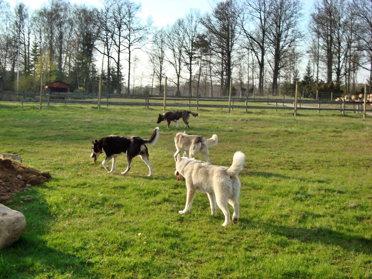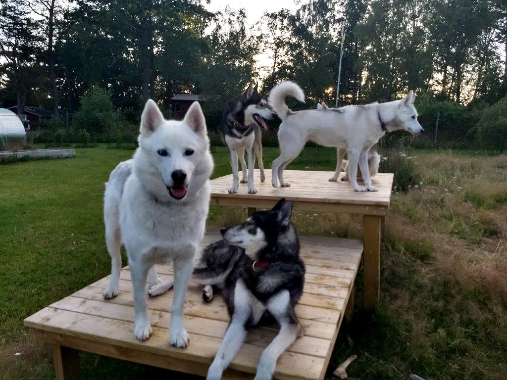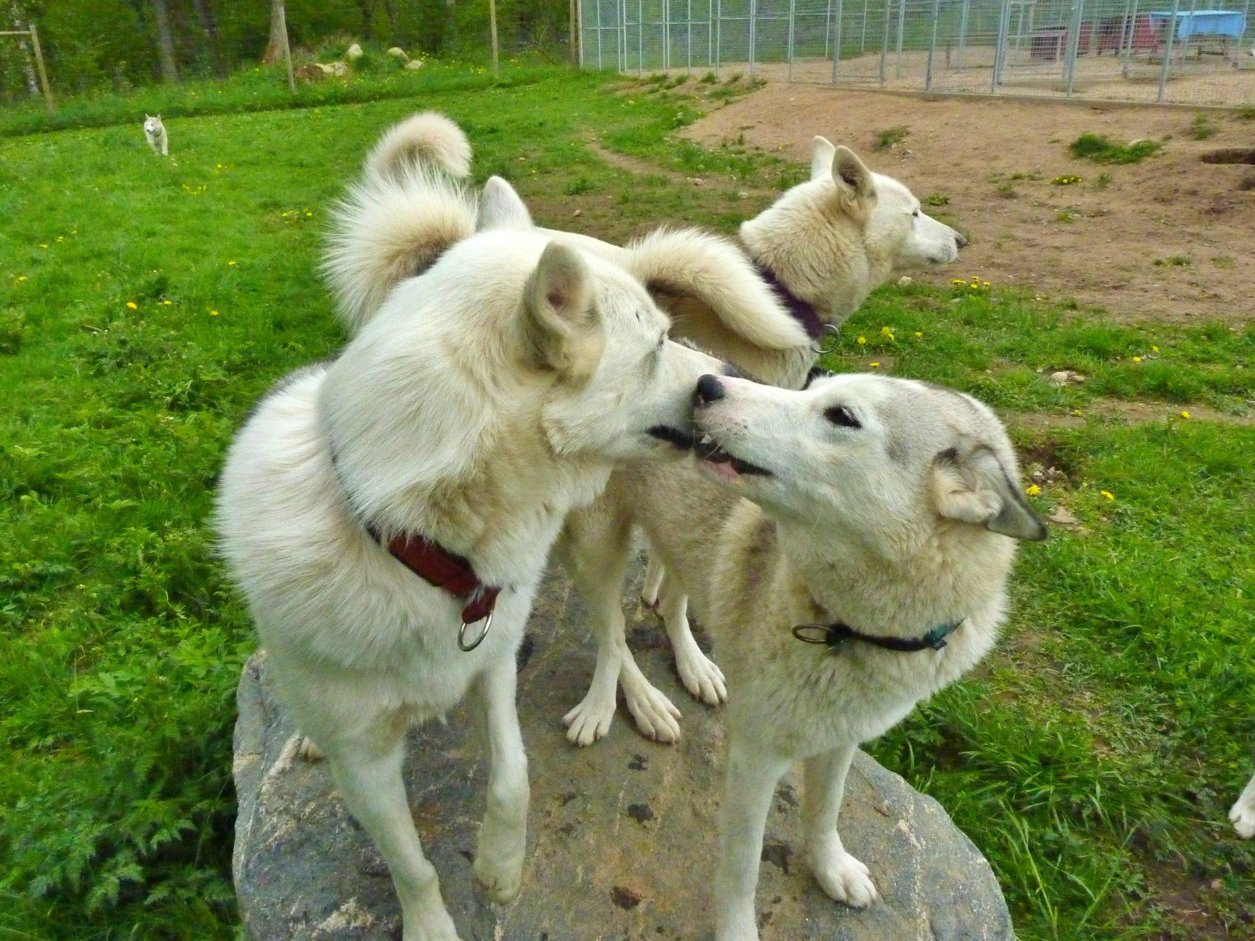 Fram blev snabbt en del i flocken som då bestod av drygt 10 hundar. Här samsas han med Tella och Zaazaa i ena hagen.