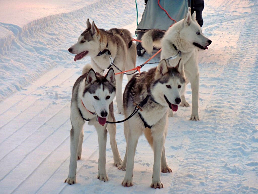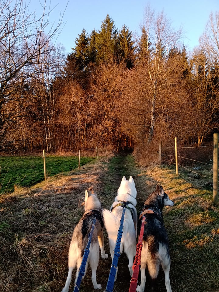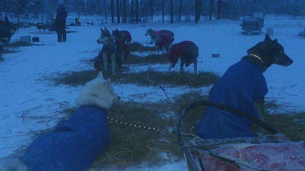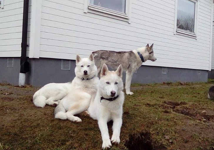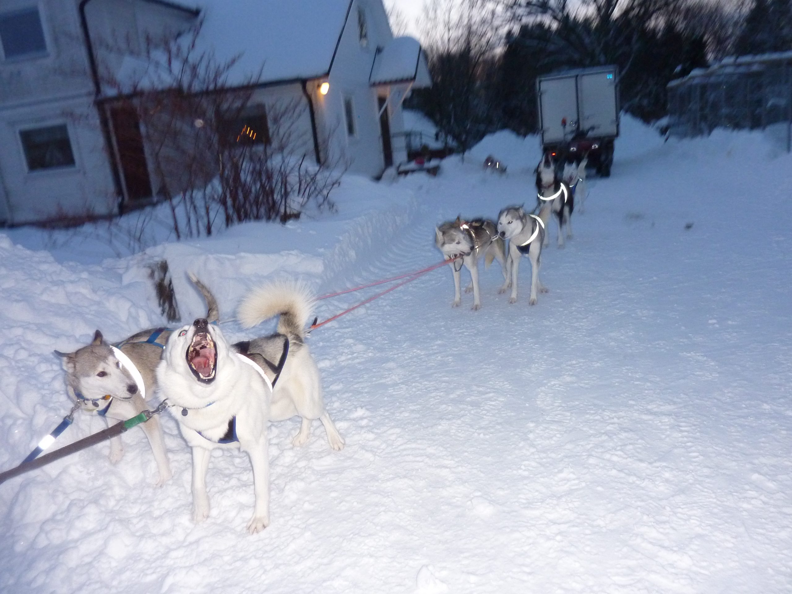 Fram blev snabbt en del i flocken som då bestod av drygt 10 hundar. Här samsas han med Tella och Zaazaa i ena hagen.