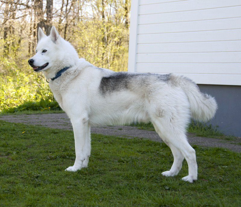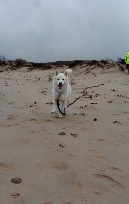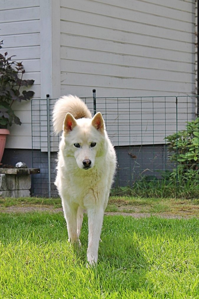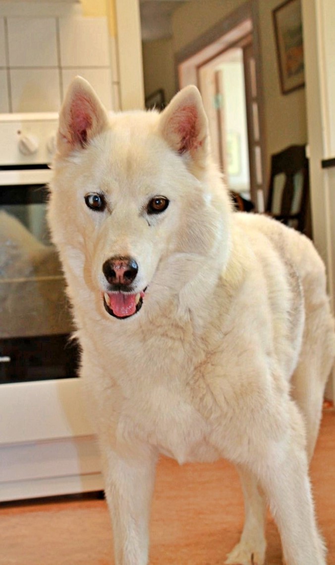 Fram kom till oss när han var nio månader. På sin väg söderut från norra Jämtland mellanlandade Fram hos vår vän Sofia Ericsson i några dagar. Påhittig som Fram var så lyckades han ta sig ut ur hennes hundgårdar en dag när Fia var på jobbet. Det var en väldigt glad kille som mötte henne på gårdsplanen! Rundfrågning bland grannar om de sett Fram under dagen visade att Fram troligtvis hållit sig på gården för ingen annan hade sett honom :-). Den bilden stämmer väl med vår erfarenhet av Fram. Han var inte någon rymmarhund. Däremot ville han väldigt gärna vara med sin matte och husse – en väldigt föraratrogen kille. Foto: Sofia Ericsson.
