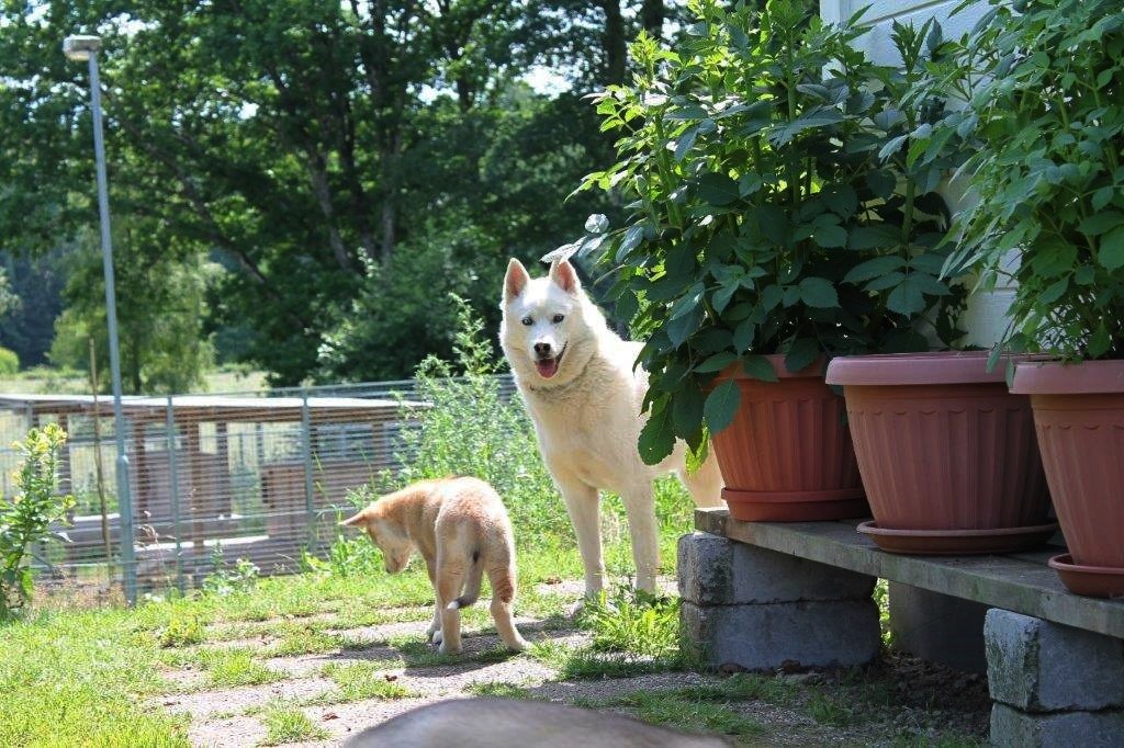 2016 blev Fram pappa till Solo. Vi parade Skade och Fram och resultatet blev en hanhundsvalp – Solo. Här är far och son tillsammans.